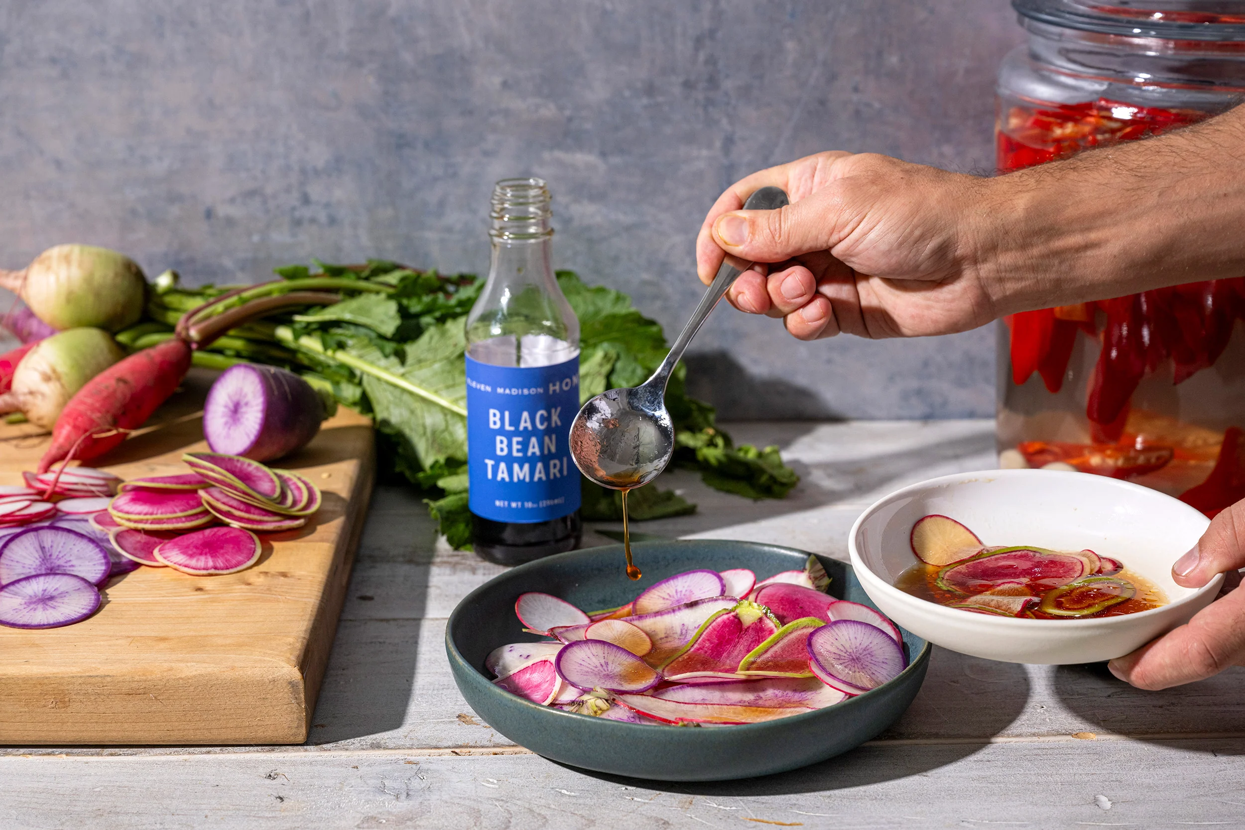 We partnered with Takashi Sato, the 8th-generation owner of San-J, the leading Tamari producer in the United States, to create these two unique expressions of Shoyu and Tamari. Made in small batches from black beans and corn, they are completely gluten-free and can be used anywhere you’d use a traditional soy sauce.